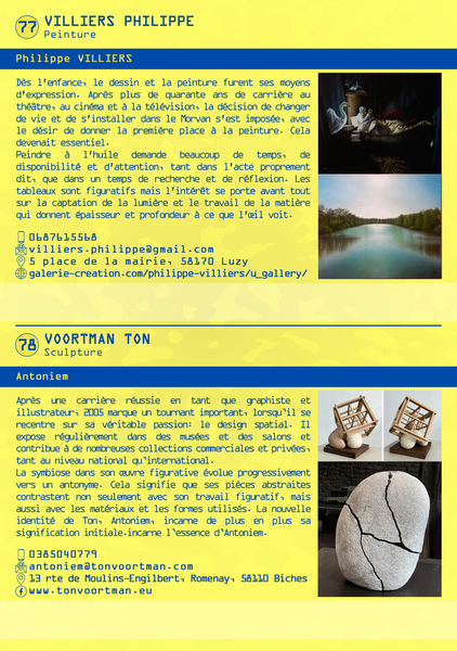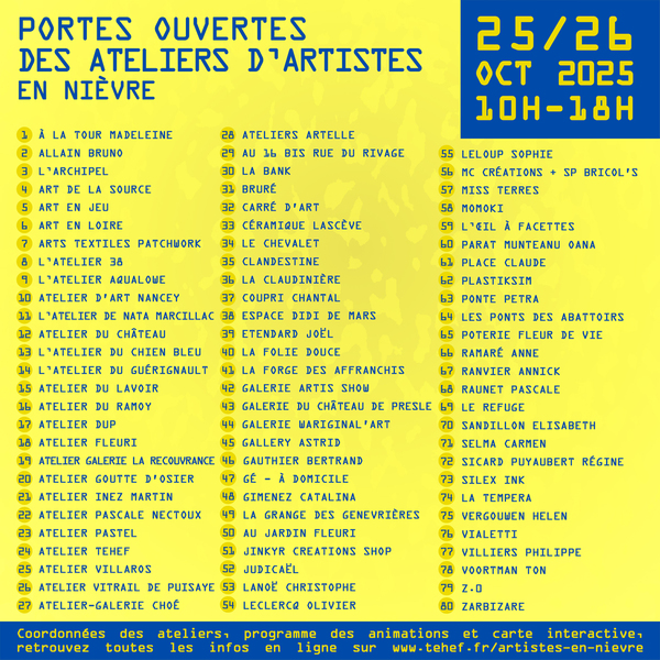 Cette année, ce sont plus de 100 artistes qui participent dans 80 ateliers répartis dans tout le département de la Nièvre ! Partez à la rencontre des acteurs de la culture du territoire au sein même de leurs lieux de création artistique, découvrez leurs techniques de travail et échanger avec eux sur leurs inspirations. Préparez votre circuit et profitez-en pour parcourir les plus belles routes de la Nièvre, entre forêts, lacs et vallées.