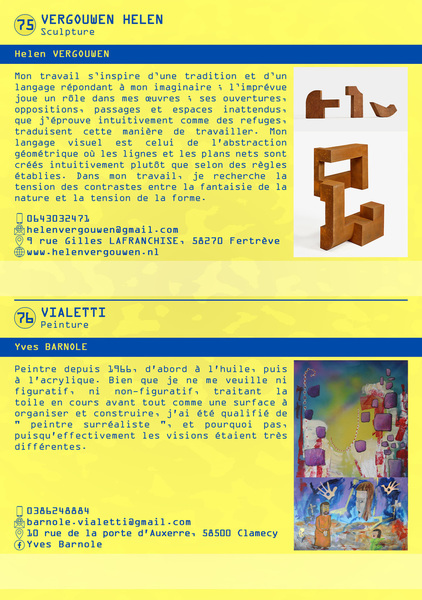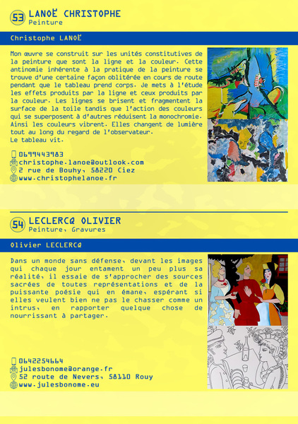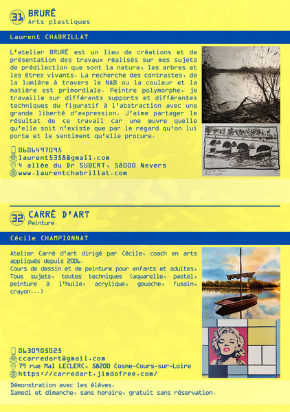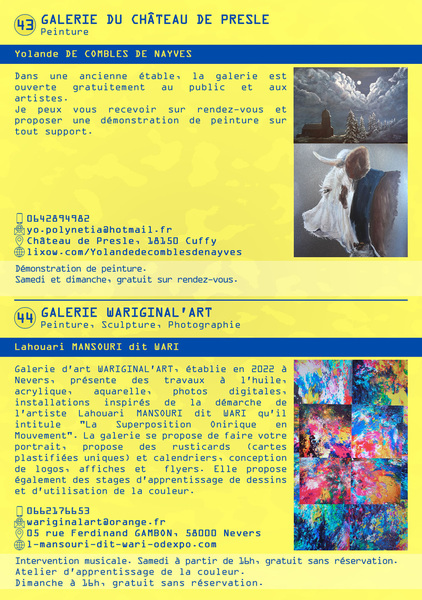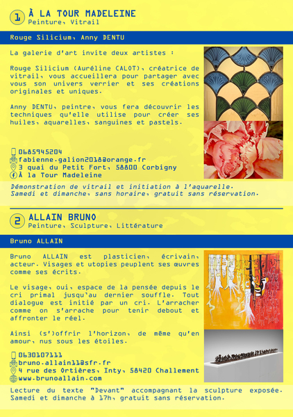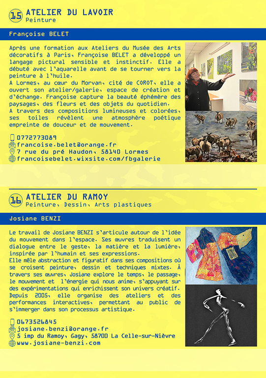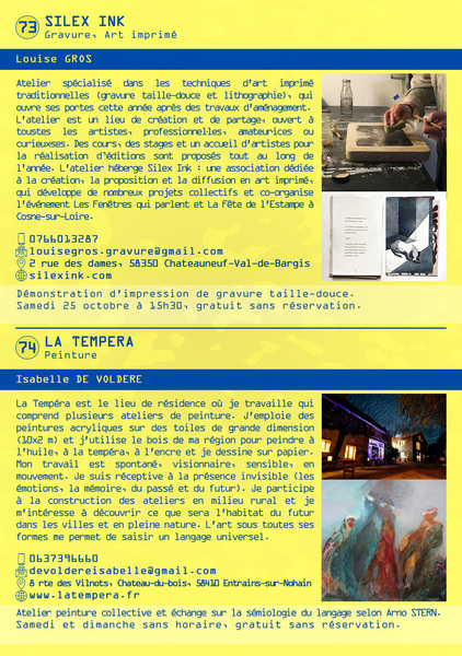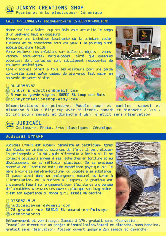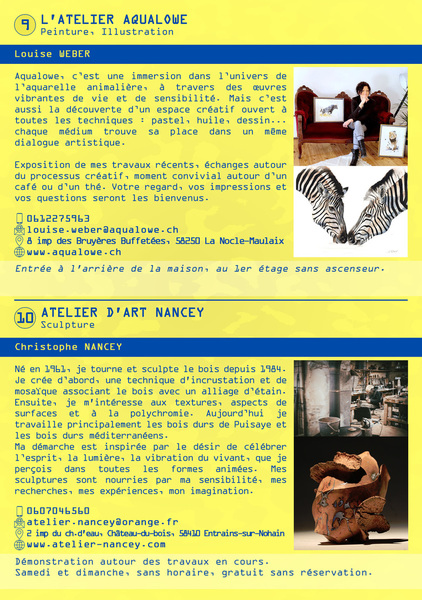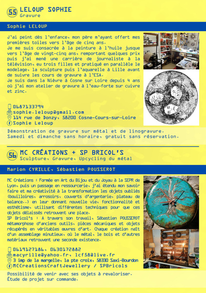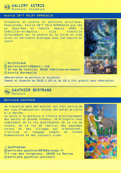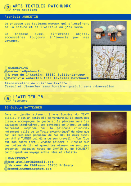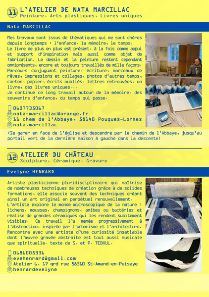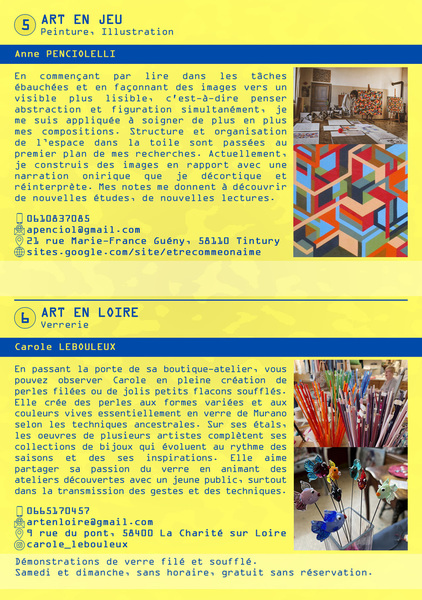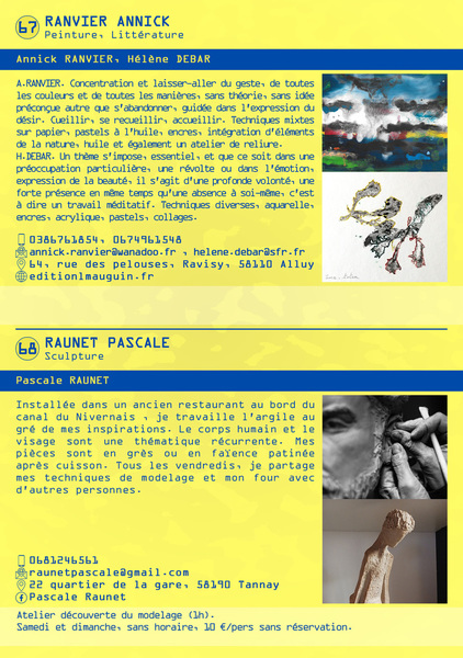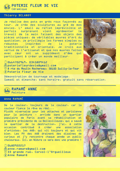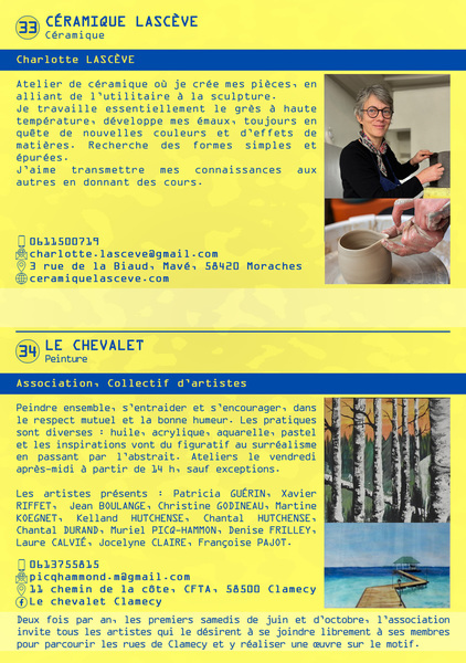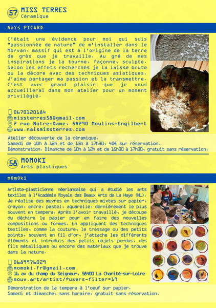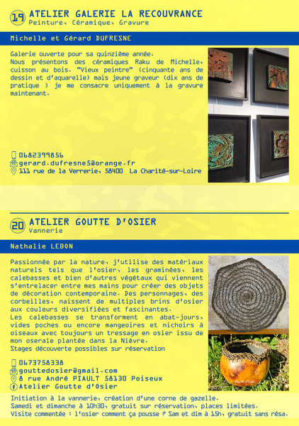Des démonstrations et ateliers pratiques sont prévus, n'hésitez pas à contacter les artistes en amont de votre visite pour préparer au mieux votre séjour en Nièvre artistique!